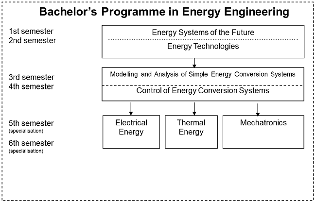 The Bachelor’s programme in Energy Engineering comprises academic elements in the subject areas of thermal and electrical energy, control theory and mechatronics. The Bachelor's programme is common to all students of the 1st – 4th semesters, after which the programme is divided into three specialisations comprising of: Electrical Energy, Thermal Energy and Mechatronics; each specialisation with 50 ECTS elective modules on the 5th and 6th semesters. The teaching on the 5th and 6th semesters is in English due to enrolment of international guest students.